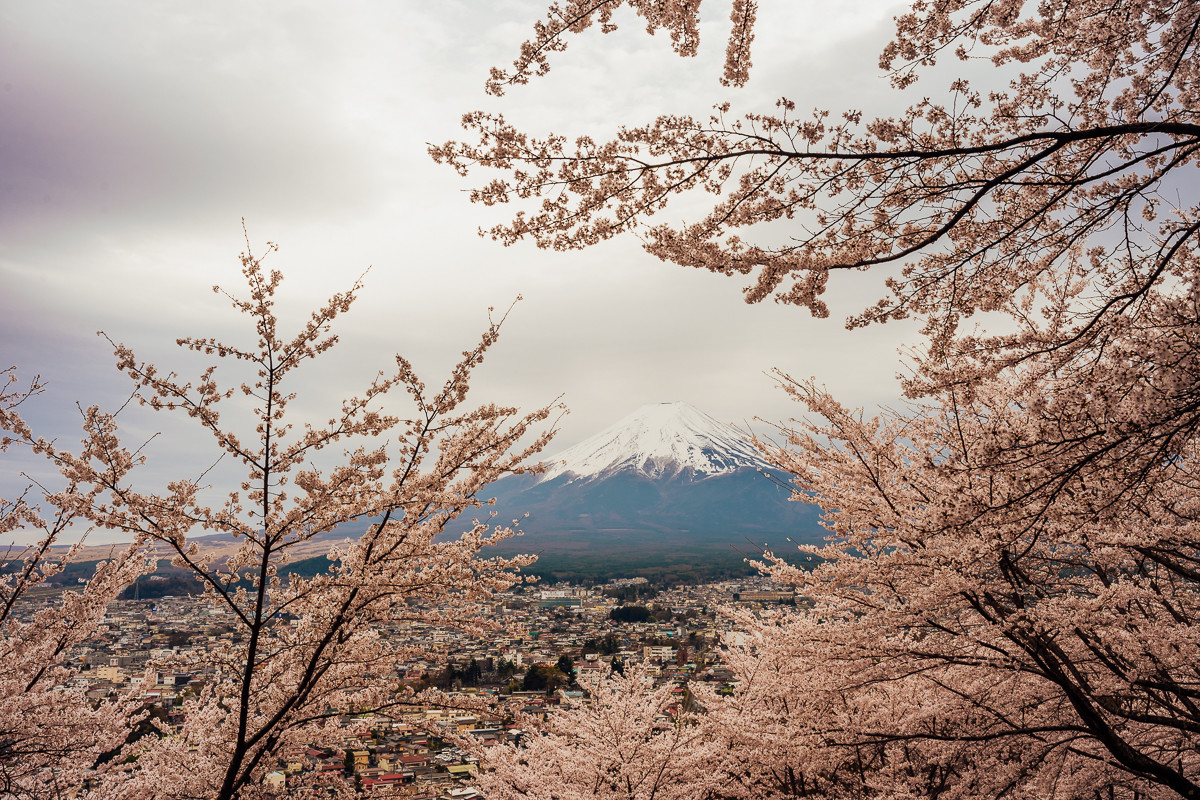 Планината Фуджи точно в пика на сакурата е момент, който сякаш не принадлежи на реалността.